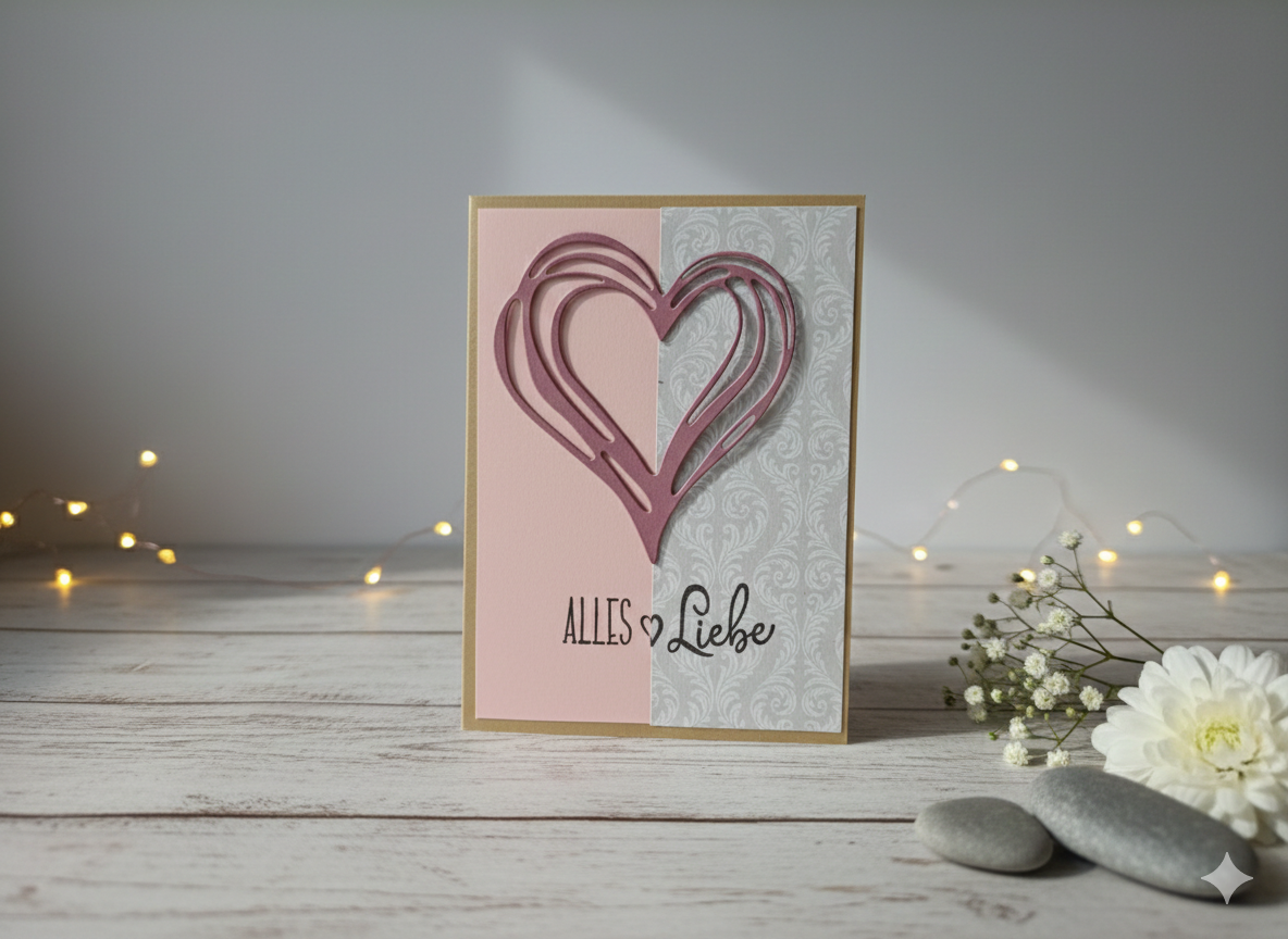 Alles Liebe - handgemachte Klappkarte. Reduziertes Herzmotiv mit feinem Schichtaufbau.